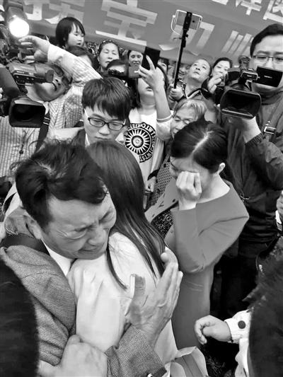 23日早上8时许,广安市武胜县城一酒店门口,数十人聚在一起,焦急地望着路口,周围的几条横幅上写着“欢迎谭圆圆回家”。当失散23年的女儿真正出现在自己面前时,59岁的谭德均再也没能忍住,从10米开外的地方跑步上前,一把将女儿揽入怀里,“爸爸对不起你,把你弄丢了。”