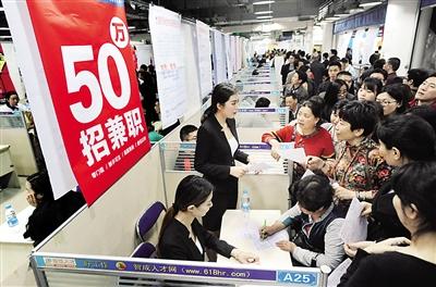 23日上午11点,重庆市江北区观音桥一家人才招聘市场内,一个挂着“五十万招兼职”海报的招聘展位前人头攒动。排队等候填表报名的人将两米宽的过道塞得满满当当。
