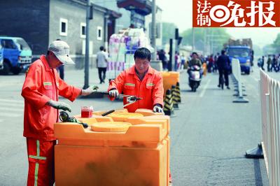 上午,工作人员在地安门东大街上安装了30个防撞箱,防止大巴车下客