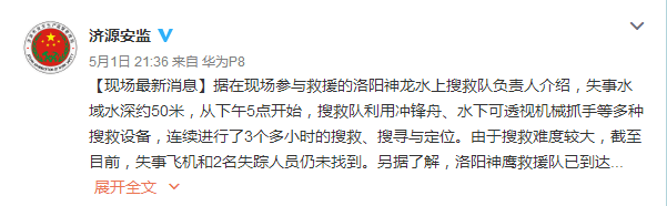 人民网郑州5月2日电(王玉兴 黄莎) 据河南省济源市安监局官微发布消息,5月1日11点20分,河南省济源市一景区内观光直升机失事。截至目前,失事飞机和2名失踪人员仍未找到。