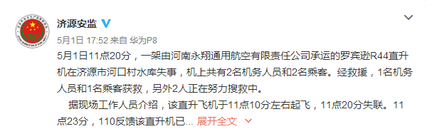据了解, 5月1日11点20分,一架由河南永翔通用航空有限责任公司承运的罗宾逊R44直升机,在济源一水库失事,机上共有2名机务人员和2名乘客。现场工作人员介绍,该直升机于11点10分左右起飞,11点20分失联。11点23分,110反馈该直升机已在济源市一水库观景台北侧2公里处坠落。11点30分左右,水库安全巡查人员救起了1名机务人员和1名乘客,另有1名机务人员和1名乘客下落不明。