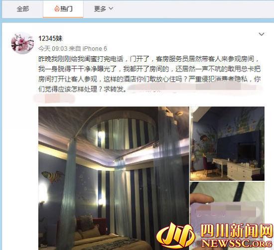 “客房服务员居然带客人来参观房间,我一身脱的干干净净曝光了。”昨日,女网友“12345妹”在微博自曝住酒店时遭遇到了这一幕。