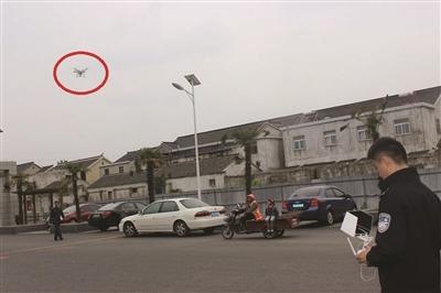 民警在民房区的空地上操控着无人机(红圈处)。