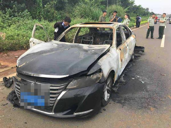 当事车辆是一辆琼A牌黑色丰田皇冠小轿车,除了车头和车牌,车子的车厢和车尾被烧得只剩框架,并且,汽车的驾驶位和副驾驶位上有两具尸体,已被烧焦。