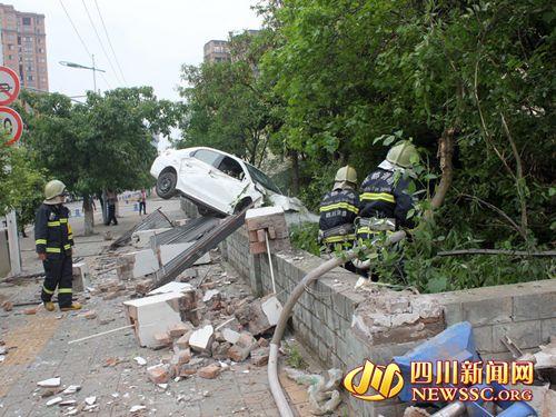 轿车撞小学围墙 车体冒烟断裂四处散落零件(图)