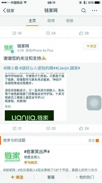 链家在微博上发出的“失联儿童守护站” 信息截图