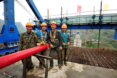 中铁一局成贵铁路项目农民工在107米桥梁高墩上合影。 牛榮健 摄