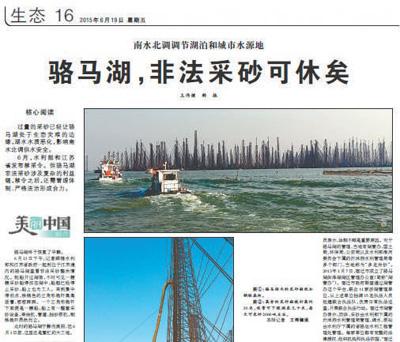 去年5月初,沂沭泗水利管理局、宿迁市、徐州市三方共同发布了《关于禁止在骆马湖水域非法采砂的通告》,明确从2015年6月1日起“禁止任何组织或个人在骆马湖水域从事非法采砂活动”;6月,江苏省政府办公厅下发《关于切实做好骆马湖水域非法采砂整治工作的通知》;6月14日,水利部和江苏省政府在宿迁召开骆马湖采砂专项整治会议。