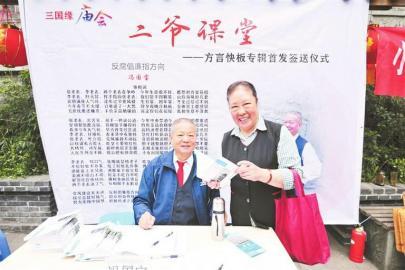 小关庙社区的川话“快板大爷”冯国宝出书啦!4月28日,在太升路街道小关庙社区举办的一次庙会活动上,冯国宝编写的《方言快板专辑》正式亮相,并举办了首发签送仪式。作为首届“能者为师——寻找社区好教师”活动的冠军,出书这件事,让身为“草根明星”的冯大爷再次体验了一把当“资格”明星的感觉。