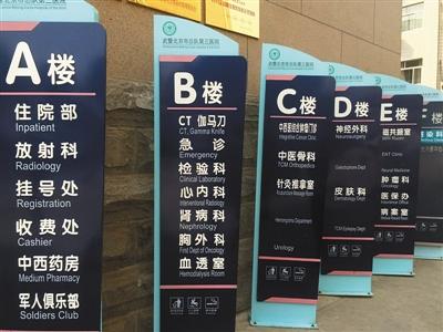 新京报记者在武警北京三院大门口发现,血管瘤专科、肿瘤科、乳腺科、中医癫痫科、耳鼻喉科、神经内科的中文标识均在记者来访时已被撕掉,但英文标识仍然保留。