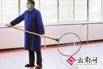 小黄突然从灯罩上跳下,在屋子内跑动。工作人员找准机会用一个直径20多厘米的网兜“活捉”了小黄。