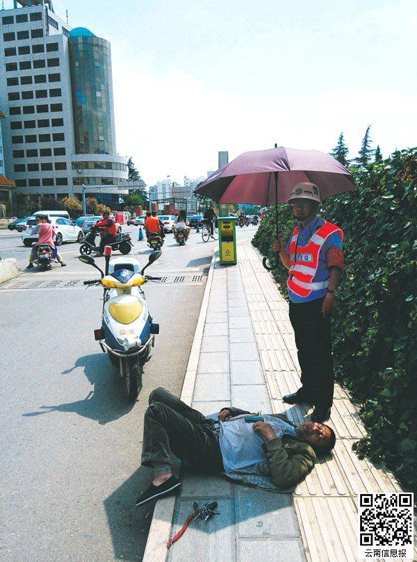 醉汉骑车逆行摔倒 协警撑伞遮阳帮联系家人(图)