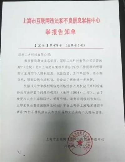 经新京报记者求证证实,5月25日,上海市互联网违法和不良信息举报中心曾向“无秘”APP的运营方深圳二木科技有限公司发送《举报告知单》显示,称单位接到实名举报,“无秘”方面发布与“陆家嘴不雅视频”所谓女主角相关的个人隐私信息系不实信息,损害公民合法权益,造成舆论进一步发酵。根据相关规定,请二木科技公司收到告知后,立即采取必要措施删除“无秘”APP平台上相关个人隐私信息。