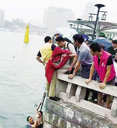 据胡洪高介绍,他在鼓浪屿从事装修工作,21日11时55分许,他在工地做完事后与一名工友途经钢琴码头,见一名女子在岸上哭泣并不停地呼救,他立马走上前,看到一名中年男子和一名年轻女子在海水里奋力挣扎,女孩漂浮在水面上,脸色苍白,岸上的人借助皮带和衣服连成一团试图搭救落水男女,但因距离远根本够不着。