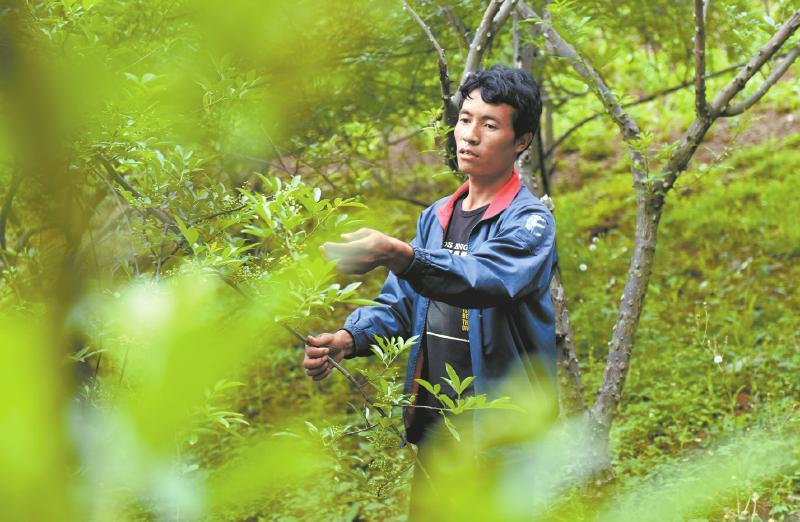 花椒、核桃树等经济作物种进了“悬崖村”。村民俄的长江在自家地里查看花椒长势。