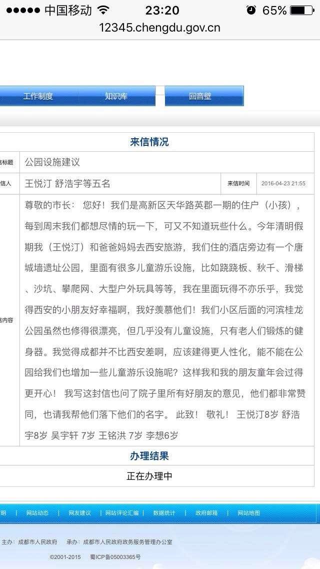 “我们能不能让成都在桂龙公园里也修点我们小朋友可以玩的大玩具啊?”王悦汀问妈妈。妈妈回答:“可以啊,不过这事儿你得跟成都市长说哦,要不你给他写封信吧。”于是,王悦汀“联合”自己小区里年龄相仿,也希望有儿童娱乐设施可以玩的另外四个小朋友,一起给成都市长写了封信——五位小朋友口述,王悦汀妈妈代笔、代发邮件——把愿望发送给了成都市长唐良智。