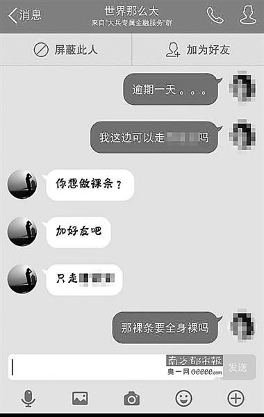 13日,记者调查发现,在一些借款群中,女大学生“裸持”借款已经成为公开的秘密,通过“裸持”可以借款的金额是普通借款额度的2至5倍,但逾期未还将面临裸照被公布的威胁,甚至有借款人威胁“裸持”借款的女生提供性服务。
