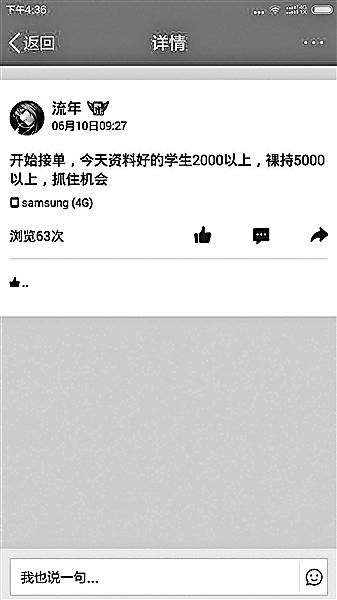 林晓借的钱越来越多,30%的利息下,很快500、1000的小额贷款就满足不了林晓拆东墙补西墙的需求了。“这时候就看到群里有中介说,女大学生可以‘裸持’借款,即使有‘负债’也没关系,发送裸照给老板就能借到更多钱。”