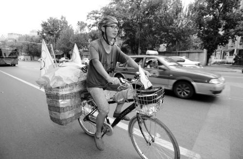“地面上人群,有合也有分……”黑瘦的山东小伙王宏晔,骑着一辆写满“关爱失独老人”字样的自行车,一路从山东省济宁北上来沈。“我有一腔热情,想用一个平凡人最笨的方法来表达我内心的希望:失独老人是孤独的,让我们一起伸出手帮帮他们吧!”