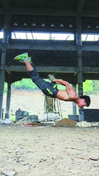 2013年前后练得最投入。在江西宁都,他拉坏了宿舍上铺的铁栏杆;在湖北野山关,他从钢管上跳下来时,踩到了一颗钉子;在西安,他第一次练单杠倒立,失误,头和脖子着地,被工地老板大骂了一顿。
