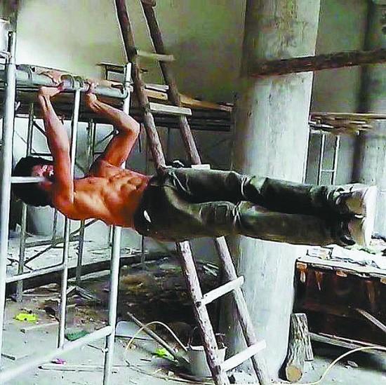 顺风旗、俄式挺身、龙旗……脚手架是现成的单杠、双杠,日复一日的训练,他学会了越来越多的动作。
