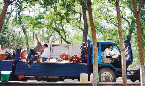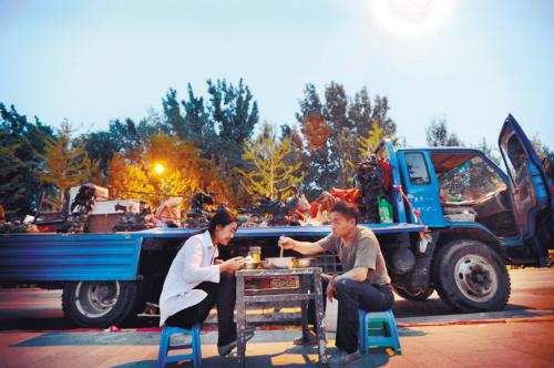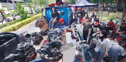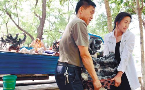 正午,燥热。鲁园古玩城对面的树阴里,停着一辆蓝色货车,52岁的郑金楼和49岁的张振文在车边支起小方桌,悠然地吃着午饭,身后的树枝随风摆动,不时有几只毛毛虫掉落下来。他们来自安徽省灵璧县渔沟镇,每年夏季都会到东北售卖灵璧石,冬季则赶往南方。一年中有一半时间他们都在路上,而那辆装载着两三吨奇石的大货车就是他们移动的家。