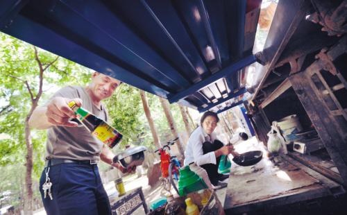 今年五月份,夫妻俩驱车来到沈阳,夜晚的驾驶室内仍有些寒意,细心的张振文带了四五条被褥。张振文每天七点左右起床,先到鲁园的公厕上厕所、打水,再到菜市场买食材和早点,中午便在储物箱里做菜,“东北人爱吃炖菜,我们吃不惯,平时我会做一些清淡的炒菜和拌菜。”