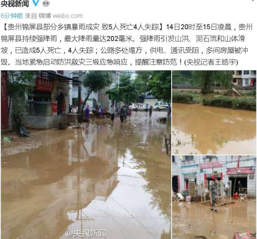 贵州锦屏县部分乡镇暴雨成灾 致5人死亡4人失踪