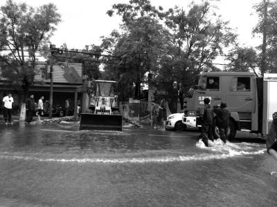 故宫消防中队队长张肖介绍,当天故宫消防中队先后分两批次出动15人,交替轮值现场,用手抬泵进行排水作业。昨天下午4点多,雨水渐小,胡同内积水基本被清理干净,消防官兵离开现场。昨晚6时,降雨逐渐增大,消防员再次赶到胡同抽水,“如果夜里雨不停,我们的人就要一直守下去。”张肖说。