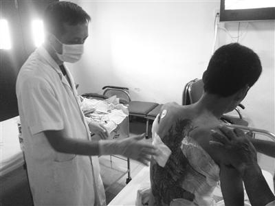 据了解,受伤男子叫宋乃平,文昌蓬莱镇人。昨日上午,记者来到琼海市人民医院心胸外科住院部看到,医生正在给宋乃平换药。记者注意到,宋乃平上身裹着纱布,床单上有一小片血迹,背部有一条被玻璃划伤的口子,医生已缝合。因为伤口还未愈合,宋乃平只有在他人帮助下才能动弹,说话有气无力。