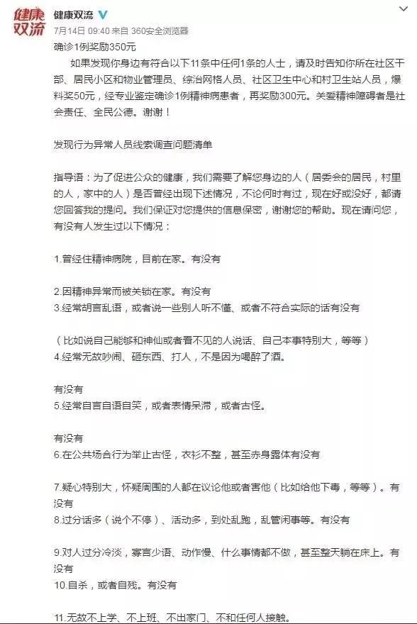 参与互动 举报“精神病患者”有奖励,这是真的吗?近日,四川成都双流区出台了一项新政策,鼓励市民举报“精神病患者”,举报一名奖励50元,确诊后再加300元。什么样的人算是“精神病患者”?对此,这项政策中还附上了一份清单,具体来说根据11个症状问题进行判断,比如无故不上学、不上班等等,满足任何一个症状都可以举报。此政策一出立即引发热议,鼓励举报到底恰不恰当?这些所谓的症状对于认定精神病患者是否合理?媒体对此进行了调查。