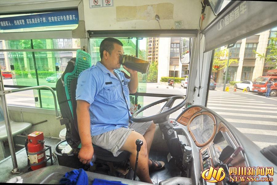 今日中午2时,记者在宜宾南客站附近,见到了宜宾公交3路车驾驶员孙弟纲,他有27年的驾龄,他驾驶的是普通公交车俗称“板板车”是没有空调的。他正在车上等待乘客,车窗全部处于打开状态,头顶还有一座风扇在运转,他不停的在喝水降温。