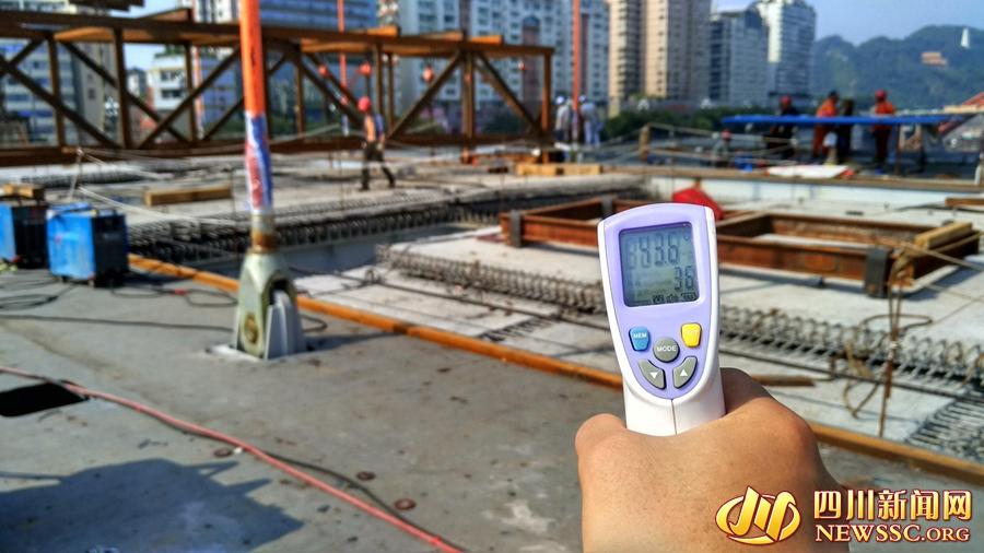 今日上午9时许,宜宾市气象台对8月18日09时55分发布的第4号高温橙色预警信号进行第5次确认有效。下午记者前往宜宾南门大桥施工现场实测温度,桥面最高温度达到53℃,空气温度在40℃左右。