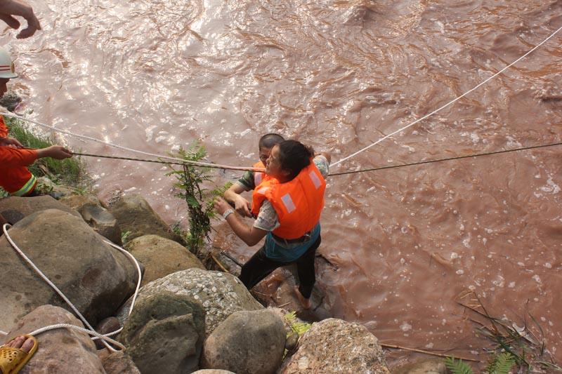 当日早上7点35分,二十八中队救援队员到达现场。经过观察,发现两人被困在河中间的车顶上,距离岸边至少20米,还有一名中年男子被大水冲至被困车辆下方一个“河中岛”。在确定了救援方案后,两名水性较好的救援队员在身上固定好安全绳,泅渡到河中的小岛上,并迅速搭建绳桥先将被困在车上的人员转移到相对安全的小岛上。8点05分,两名被困车上的人员暂时脱离危险,成功转移到“河中岛”上,此时大水已漫过车顶。4分钟后,三名被困人员被成功转移至岸边,所幸只有一人轻微擦伤。