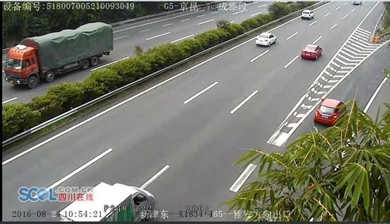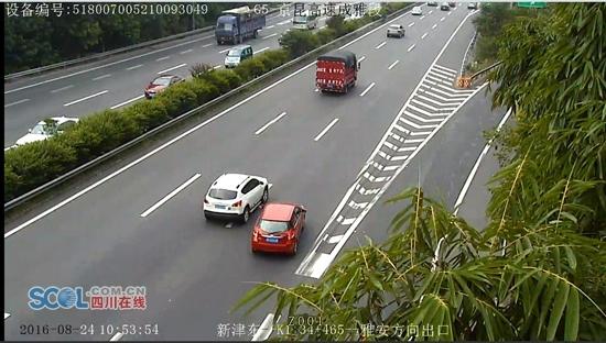 记者从高速交警提供的视频看见,当天10时53分许,一辆红色的小车快要开过成雅高速新津东出口时,突然从右侧第二车道变道到第三车道,准备碾压导流线开出出口。不过,驾驶员在原地停了两秒钟,这时,更大胆的一幕出现了,红色小车开始慢吞吞的在高速路上“蛇形”倒车。只见这辆车左一盘子、右一盘子,在第三条车道和第二条车道之间拐来拐去向后倒车,花了32秒的时间在高速公路上倒车了20米的距离,这期间,不停有大货车、小车按着喇叭从红色小车的左边、右边快速开过,场面非常紧张。