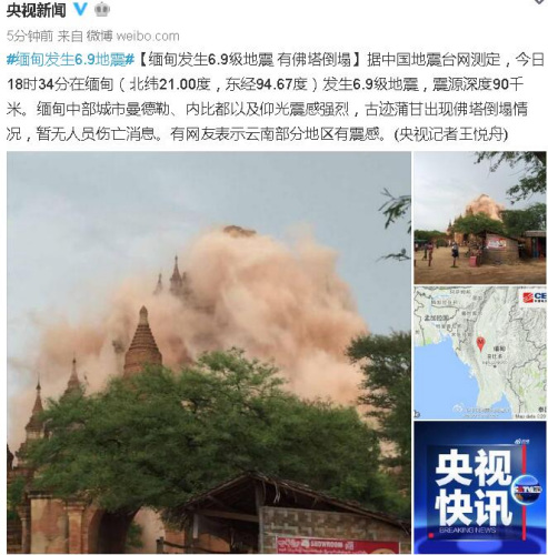 缅甸发生6.9级地震有佛塔倒塌 网友称云南有震感