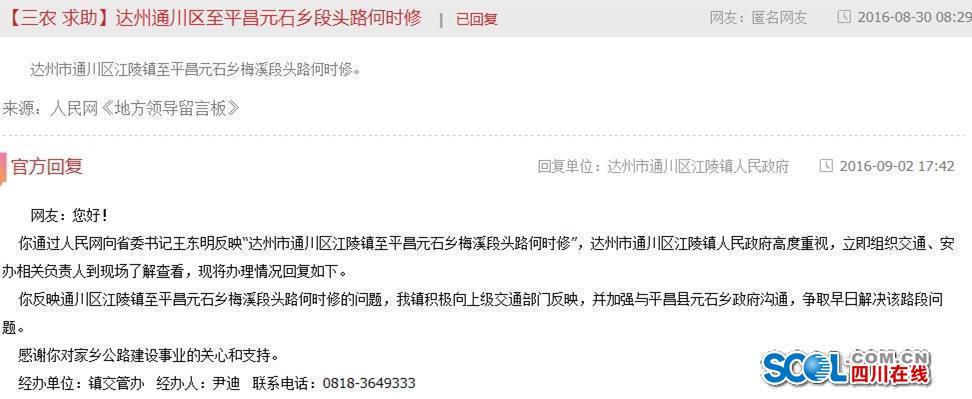 8月30日,有匿名网友在人民网《地方领导留言版》三农求助板块留言:达州市通川区江陵镇至平昌元石乡梅溪断头路何时修?次日上午9时38分,达州市通川区江陵镇人民政府正式回复称:该路段对通川区和江陵镇无任何意义,青龙村村民修路的意愿不高,如平昌县元石乡愿意修该路段,江陵镇人民政府将配合做好相关工作。该回复署名经办单位为江陵镇人民政府,经办人为李兴见。