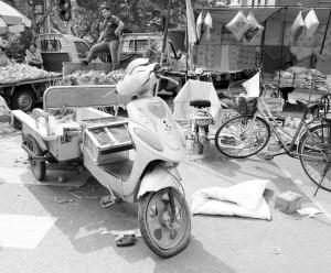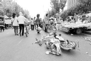 昨日10时20分许,记者从石市谈固南大街向东拐入绿洲路,集市上仍聚集着不少人。陌生或熟识的人们,都在议论着刚刚发生的惊险一幕。马路上可见深深的白色划痕,一直向东延伸。步行至集市中段,一辆伤痕累累的蓝色电动车横在路上,车把和座椅处断裂变形,零件碎片散落了一地。20米外,一个烤红薯的烤炉受损变形,炉渣和被碾碎的烤红薯散落了一地。继续向东走,两辆电动车和一辆自行车倒在路边,车筐里的蔬菜撒在地上。集市东头,一辆电动三轮车横在路中央,电瓶和车灯直接被撞到附近一辆轿车底下。“这是我的三轮车,西边被撞坏的烤炉本来是放在这辆车上的。”一位卖烤红薯的摊贩说,当时黑色奥迪从西往东冲过去,为了阻拦肇事车辆,有人把她卖烤红薯的三轮车推到路中间,不料车上的烤炉被当场撞翻在地。但奥迪车却没有因此停下,而是顶着三轮车一直横冲直撞往东走,一直把车拖到了集市最东头。