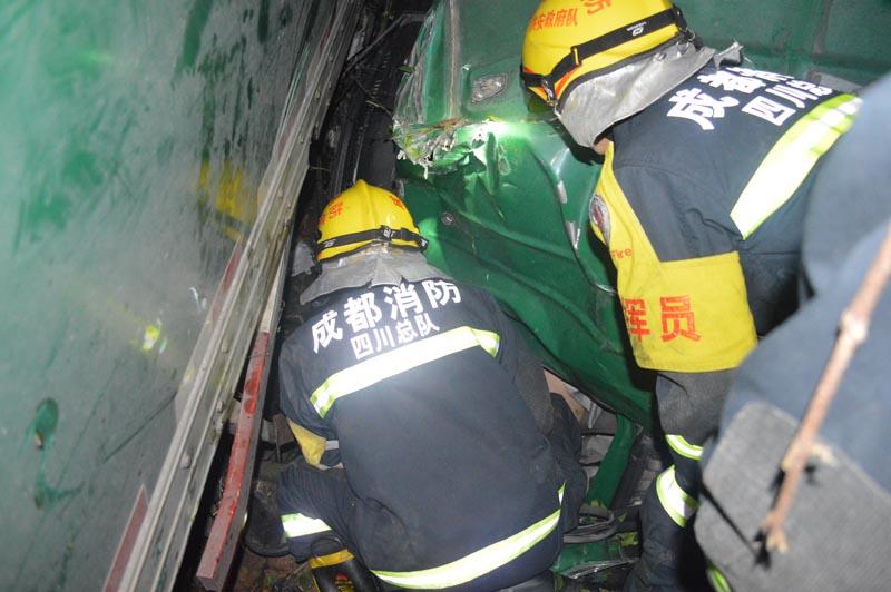 昨日凌晨4点38分,成都市公安消防支队龙泉洪安专职消防队接到支队指挥中心命令称,成南高速义和收费站往成都1公里处发生三车追尾交通事故,现场有人员被困,情况十分危急。接到报警后,消防队员立即赶往现场。