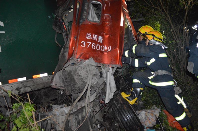 4时50分,消防队员到达现场,此时,高速交警已对现场进行警戒。通过询问知情人和现场侦查后,消防队员得知,在事故中,最前方的大货车只是后车牌处受损;中间的货车直接被后面载有保时捷汽车的拖挂车撞到高速公路下,车头严重变形、车内驾驶员被压得无法动弹;而载满保时捷汽车的拖挂车的车头直接撞在前方货车的车尾,车头下压着一名已经没有生命体征的随车人员,车内驾驶员严重受伤。