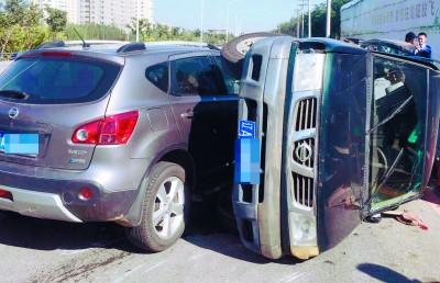 9月29日13时30分左右,浑南飞云路上,同是日产牌的SUV与皮卡发生了碰撞,其中,皮卡被SUV撞翻在地。