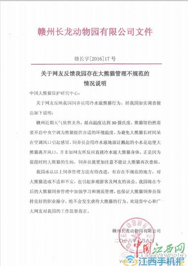 10月7日,中国大熊猫保护研究中心官方微博称,收悉网友反馈赣州动物园可能存在冷水滋熊猫的情况,并在做进一步核实。10月8日,该中心发布《关于赣州动物园大熊猫饲养管理中存在不规范情况的说明》,称已要求赣州动物园按照大熊猫饲养管理规程进行饲养管理操作,杜绝不规范行为的发生。