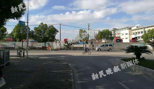 图说:事故发生小区对面的停车场,围墙被撞破。新民晚报新民网见习记者 俞金旻 摄