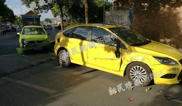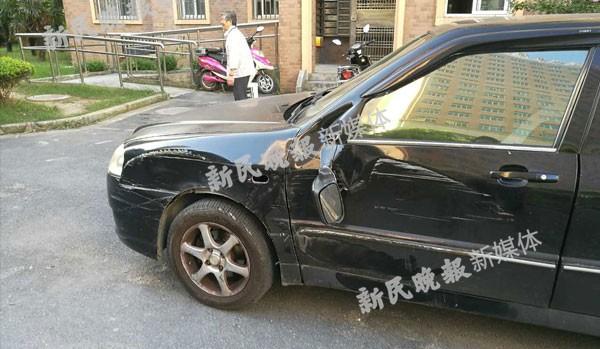 图说:小区西门的主干道两侧停放着的10多辆私家车几乎无一幸免,车辆各部位不同程度受损。新民晚报新民网见习记者 俞金旻 摄