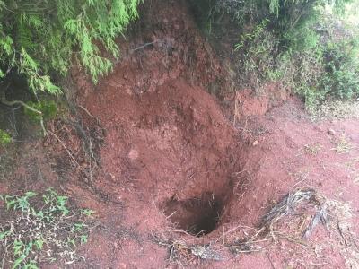 顺着吴大爷的指引,记者穿过一片芦苇地,整条山路杂草丛生,无路可寻。在山顶的一棵柏树下,记者找到了尸体被埋处,一个约半米深、宽半米的泥坑,树根裸露在外,周围新翻的泥土掩盖了杂草。现场还有警方取证时留下使用过的一次性手套。