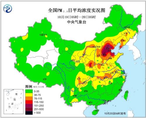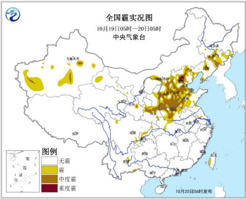 19日05时至20日05时,华北中南部、黄淮北部、陕西关中等地的部分地区出现轻至中度霾,局地重度霾,上述地区 PM2.5平均浓度超过115微克/立方米,出现中至重度污染。此外,20日早晨,华北南部、江汉东部等地出现大雾天气,局地出现能见度不足500米的浓雾。