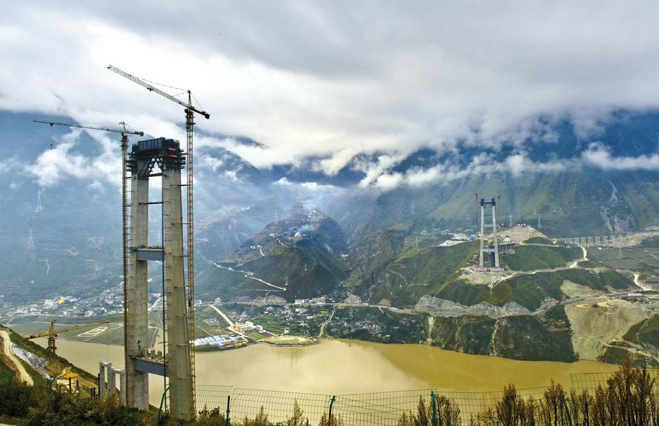在汹涌的大渡河上,一座崭新的大桥——泸定大渡河特大桥,正在火热建设中。从空中俯瞰,两岸雪山时隐时现,两座188米的桥墩矗立在两岸,十分壮观。