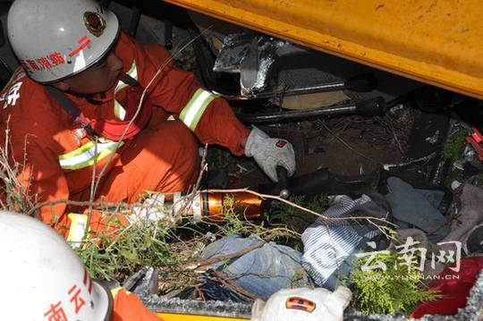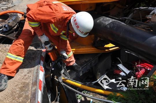 12时09分,救援官兵到达现场,经勘查,该驾驶员肚子与头被驾驶室压住,已当场死亡。1名消防员用锤子将驾驶室玻璃砸烂,然后由另一消防员进入驾驶室利用液压剪扩钳将空间扩大,再用液压顶杆固定。