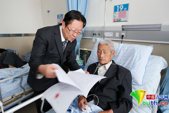 9月29日,邱少云名誉权案代理律师向病床上的邱少华老人传达判决书内容。那一天,老人特意嘱咐家人为其换上了正装。中国青年网记者 张炎良 摄