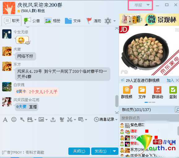 QQ群聊天对话框中的举报按钮(右上角红框处)。网友供图